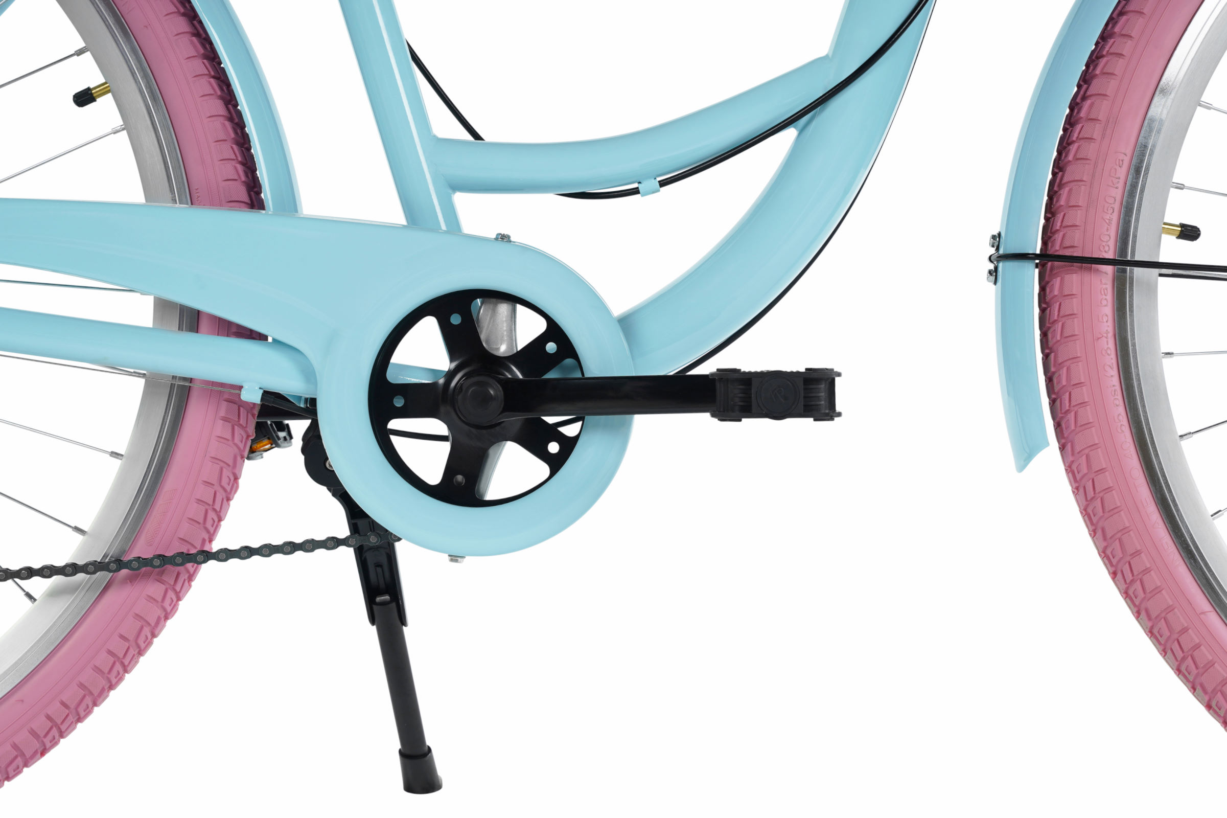 The slim tires make the bike light and comfortable, while the 28″ aluminum rims provide extra comfort while riding. The bike is easy to handle, performs well on uneven terrain, and the steel hubs ensure long durability. Thanks to the mudguards, it’s ideal for wet surfaces and keeps clothes clean.