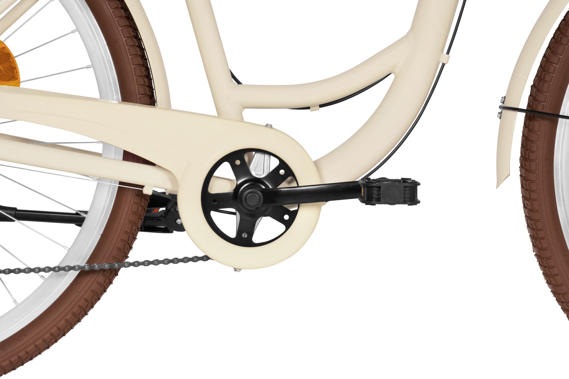 At the back, there is a classic rear carrier where you can attach a child seat, extra bags, or transport other items. This bike comes with a woven basket and all accessories shown in the picture.